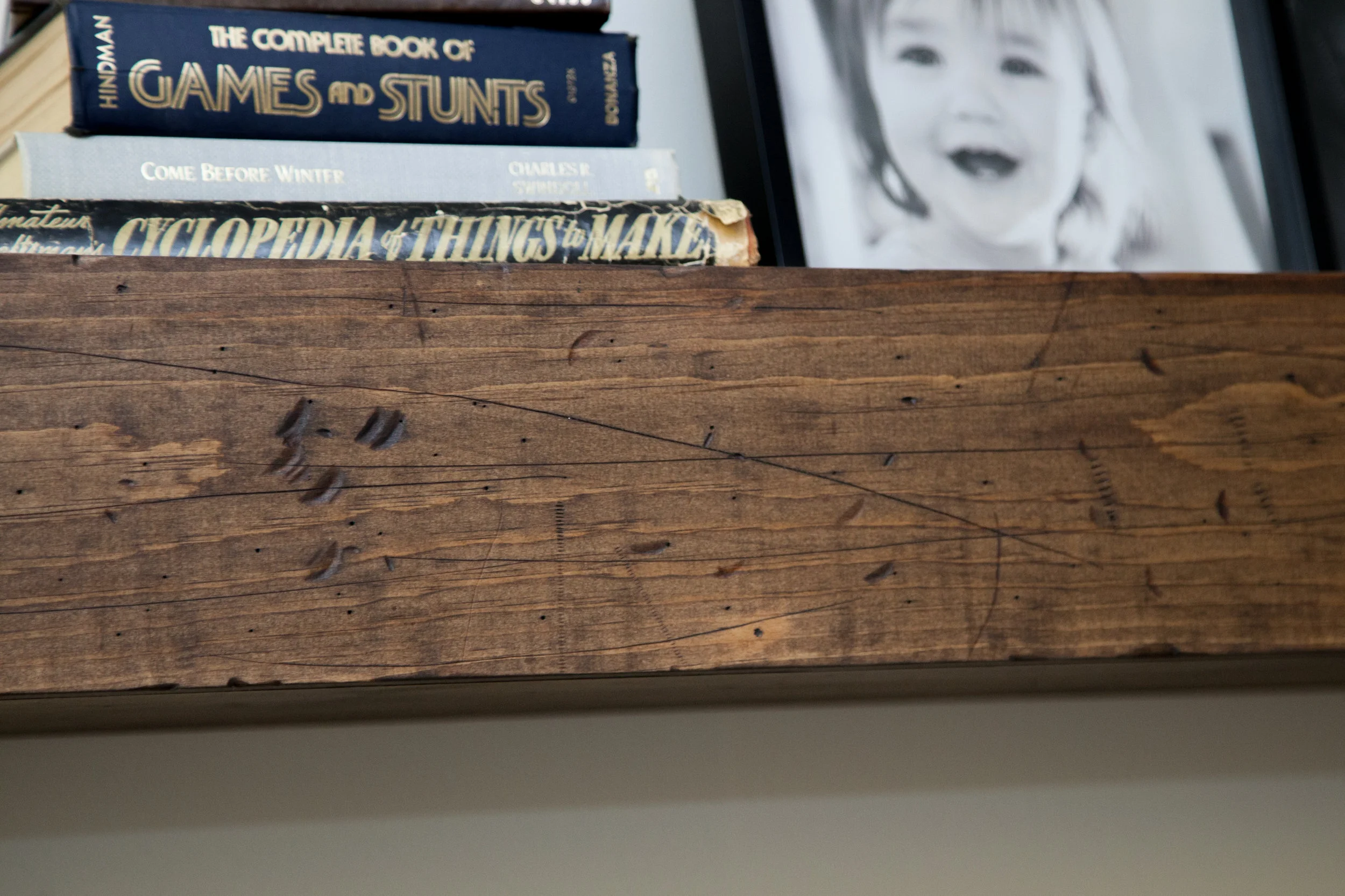 My wonderful husband built me the wooden shelf, using free plans from Shanty 2 Chic! It turned out great, and the fun part was when I got to distress that new wood to make it look old! Seriously, so much fun! I went to work with srews, hammers and all sorts of things to mess up the wood before staining it. I used Special Walnut stain by Minwax, (which I found in the basement left from previous house owners)! Yay for free stuff, right!?